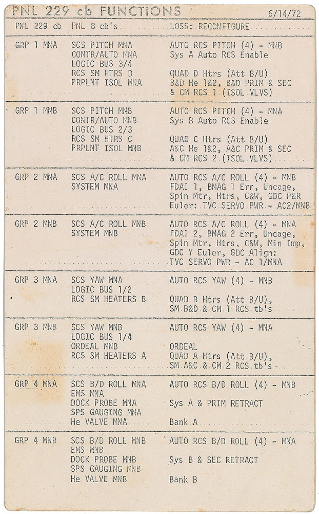 Double-sided cue card used during training for the Apollo 17 mission, 5.5 x 9, dated June 14, 1972. The card is headed “PNL 229 cb Functions” on both sides, with each side featuring three columns designated for “PNL 229 cb,” “PNL 8 cb’s,” and “Loss: Reconfigure.” Reverse side bears a small swatch of affixed Velcro, and an ink notation in the upper right corner, “CMS, 7A.” In fine condition.