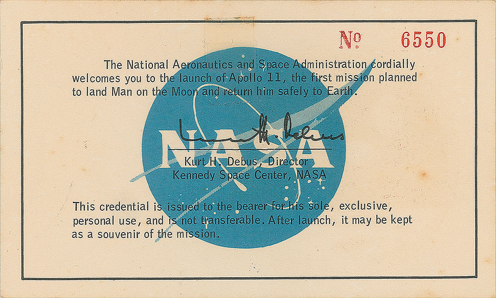 Apollo 11 launch pass, number 6550, 5 x 3, featuring the mission insignia and an image of the moon, signed on the front in blue felt tip by Neil Armstrong, and in black felt tip by Buzz Aldrin and Michael Collins. Also signed on the reverse in black ink the first director of the Kennedy Space Center, Kurt Debus. Printed text on reverse informs the holder that the pass may be kept as a souvenir after the mission. In fine condition. Marking the debut instance in which we’ve auctioned an Apollo 11 launch pass signed by either a crew member or a NASA employee, this incredible fully signed item is enhanced furthermore by its great visual appeal and the presence of KSC Director Debus. Pre-certified Zarelli Space Authentication.