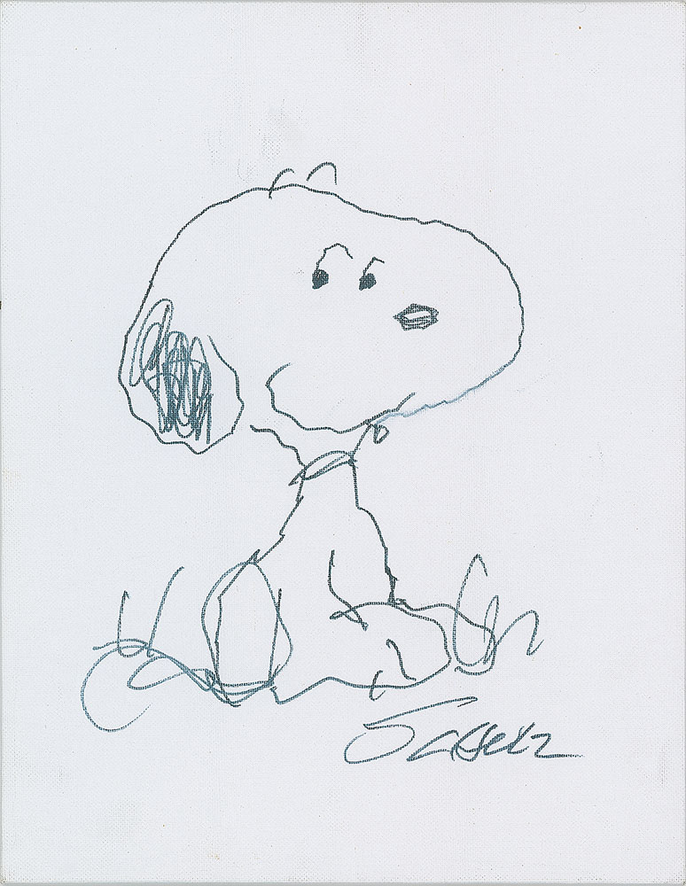 Unusually large felt tip sketch of Snoopy sitting in the grass on a white 11 x 14 canvas board, signed “Schulz.” In fine condition. Accompanied by a photocopied letter of transmittal from Schulz’s office. Pre-certified PSA/DNA.