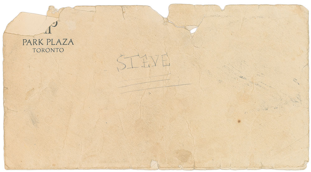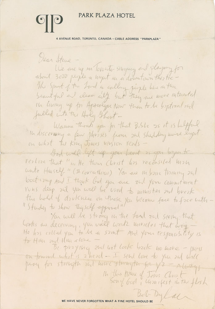 ALS, signed “Bob Dylan,” one page, 7.25 x 10.5, Park Plaza Hotel letterhead, no date but circa April 1980. Letter to a friend named “Steve,” in full: “We are up in Toronto singing and playing for about 3000 people a night in a downtown theatre—The Spirit of the Lord is calling people here in their beautiful and clean city but they are more interested in lining up for Apocalypse Now than to be baptized and filled with the Holy Ghost—Wanna thank you for that Bible as it is helpful in discovering a few phrases from and shedding more light on what the King James version reads—God will lift up your heart as you begin to realize that ‘He thru Christ has reconsiled [sic] man unto Himself’ (II Corinthians). You are in basic training and boot camp and I thank God you are and your commitment runs deep and you will be used to minister and break the hold of darkness in those you become face to face with—‘Study to show thyself approval.’ You will be strong in the Lord and seeing that looks are deceiving, you will work miracles that way—He has called you to be a saint and your responsibility is to him and him alone—Be praying and not looking back no more—press on toward what is ahead—I send love to you and will pray for strength and more strength for ya—Always in the name of Jesus Christ Son of God, Manifest in the flesh.” In very good to fine condition, with mailing folds and light fading. Accompanied by the original transmittal envelope, addressed in Dylan’s hand to “Steve.”
