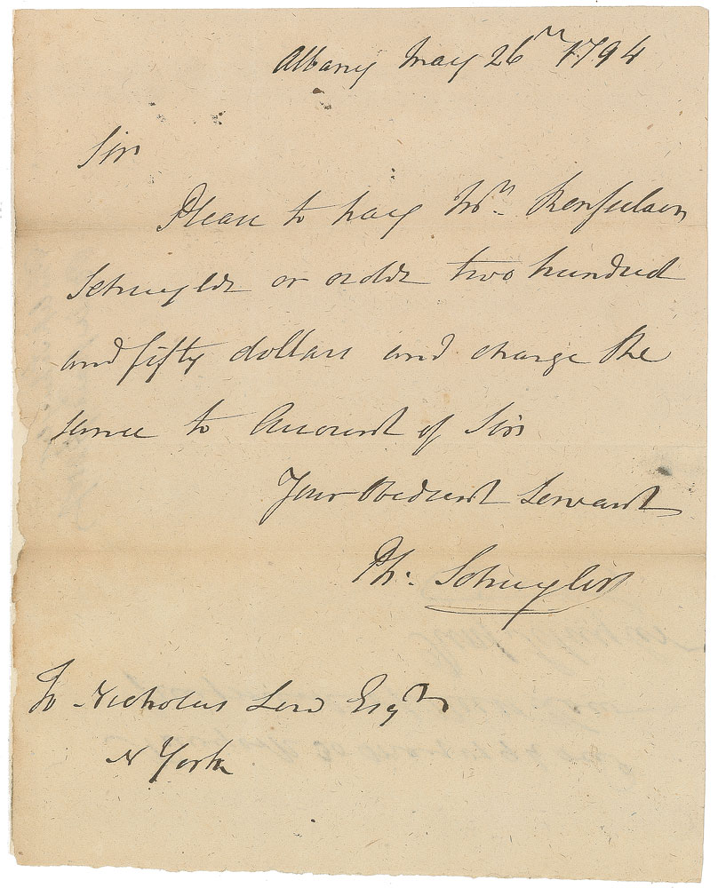 American soldier and statesman (1733–1804) who served as a general in the American Revolution and was a member of the first session of Congress as a Senator from New York. ALS signed “Ph: Schuyler,” one page, 6.25 x 7.75, May 26, 1794. Letter to noted New York merchant Nicholas Low. In full: “Please to pay Mr. Rensselaer Schuyler or order two hundred and fifty dollars and charge the same to Account.” In fine condition, with a mounting strip to the left edge. Pre-certified PSA/DNA.