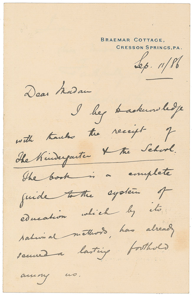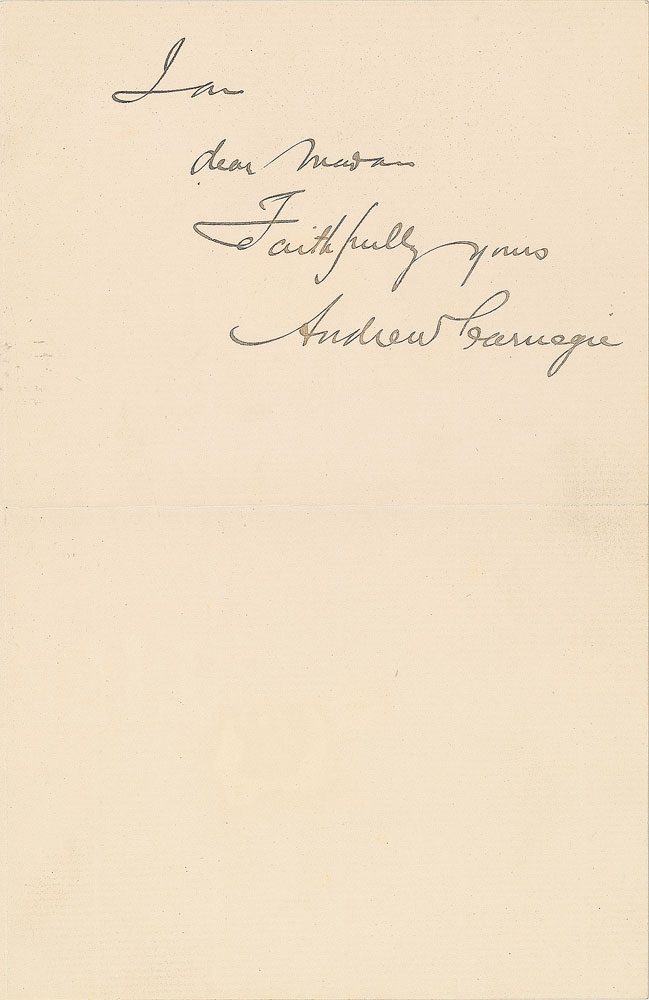 ALS, two pages on two adjoining sheets, 4.5 x 7, Braemar Cottage letterhead, September 11, 1886. In part: “I beg to acknowledge with thanks the receipt of The Kindergarten & the School. The book is a complete guide to the system of education which by its rational methods, has already secured a lasting foothold among us.” In fine condition, with a few faint stains. Excellent content from the famed steel industrialist who made unparalleled philanthropic contributions to the promotion of education. Pre-certified PSA/DNA.