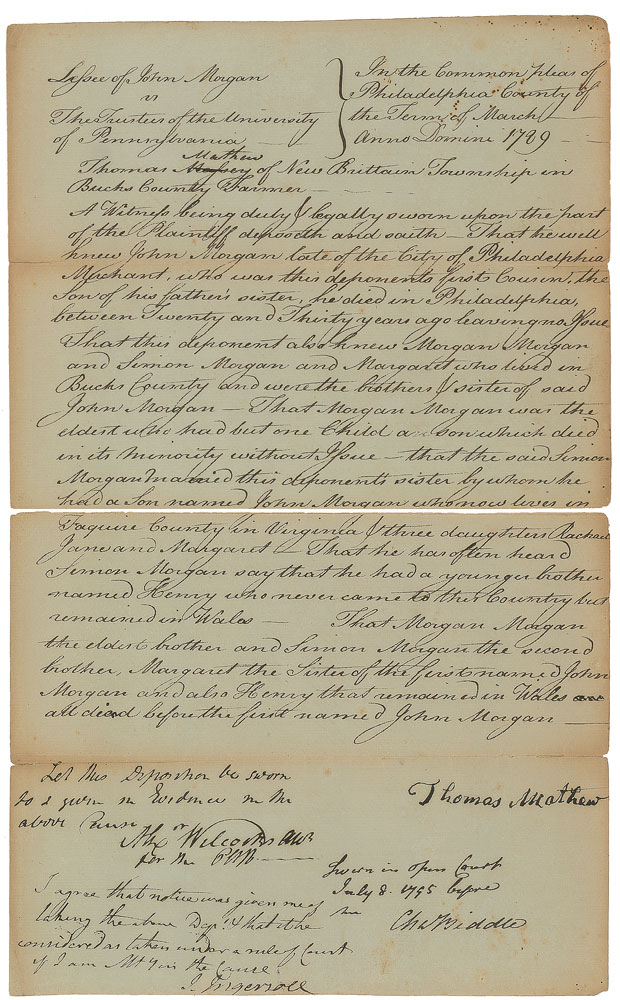 Signer of the US Constitution from Pennsylvania (1749–1822) who also ran unsuccessfully as the Federalist vice-presidential candidate in the 1812 election. Manuscript DS, signed “J. Ingersoll,” one page, 8 x 12.75, July 8, 1795. Legal deposition in the case of “Lessee of John Morgan vs. The Trustees of the University of Pennsylvania,” in part: “Thomas Mathew of New Brittain Township…A Witness being duly & legally sworn upon the part of the Plaintiff deposeth and saith—That he well knew John Morgan late of the City of Philadelphia, Merchant, who was this deponent’s first Cousin.” Endorsed at the conclusion by Ingerasoll, “I agree that notice was given me of taking the above Dep’n.” In very good condition, complete separation to central horizontal fold, other splits to folds, and foxing. Pre-certified PSA/DNA.
