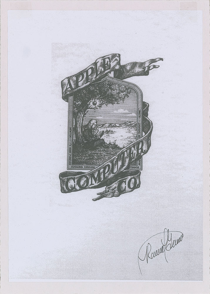 Co-founder of Apple Computer along with Steve Jobs and Steve Wozniak (born 1934). Laserprint copy of the original logo design for Apple Computer Co., 7 x 9.75, signed in the lower right in black ink, “Ronald G. Wayne,” over his embossed personal seal. Affixed at the top edge to a slightly larger mount. In fine condition. Wayne received a 10% stake in Apple as one of the company’s three founding partners, but he relinquished his equity only two weeks later for the sum of $800. He was the designer of this logo, which depicts Isaac Newton under a tree with an apple dangling over head. Pre-certified PSA/DNA.