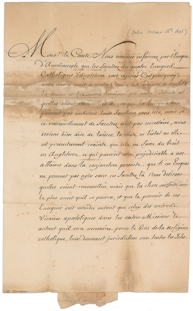 LS in French, signed “Jacques R,” one page both sides, 8.25 x 13, October 1, 1693. Untranslated letter to Count Caprara, auditor of the Rota at Rome. The embossed paper seal affixed to the second integral page remains mostly intact. In very good condition, with staining, small areas of paper loss, and old repairs to integral leaf. Pre-certified PSA/DNA.