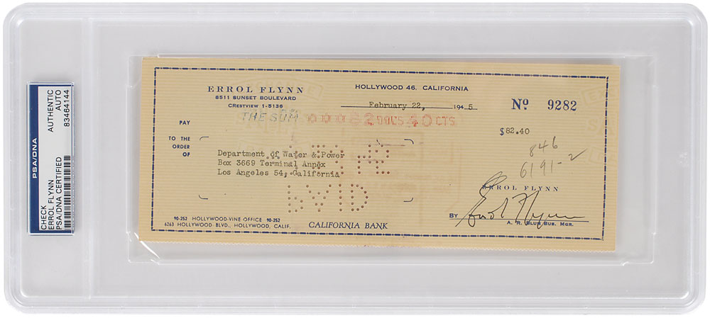 Personal check, 8.5 x 3.25, filled out in type and signed by Flynn, payable to Department of Water & Power for $82.40, February 22, 1945. Encapsulated in a plastic PSA/DNA authentication holder. In fine condition.