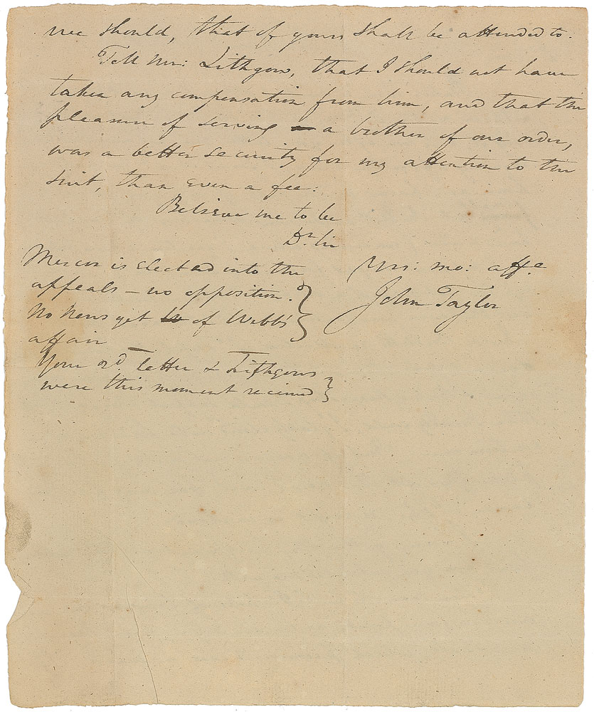 Politician and writer (1753–1824) known for his works that provided inspiration to the later states' rights and libertarian movements. ALS signed “John Taylor,” one page both sides, 6.75 x 8, November 18, 1789. Letter to Attorney General Charles Lee. In part: “Baker came to court & obtained a verdict against Lithgow…without my observing it…but upon enquiring after the cause, I found it out in half an hour, and…smelt out Bullitt as knowing something of Triplett’s hand writing…I kicked up the devil of a dust, set Baker’s verdict aside and the cause was continued until the next court. Judge Bullitt’s recollection of Triplett’s hand writing does not seem too me to be sufficiently decisive.” In fine condition, with a small edge chip. Pre-certified PSA/DNA.