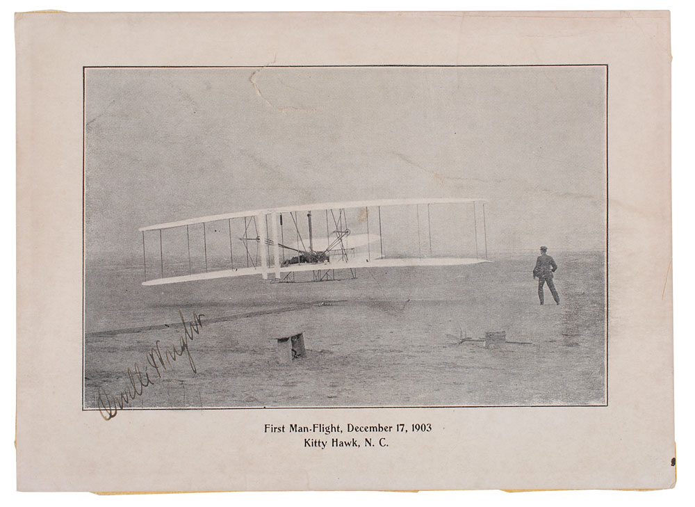 Sought-after 6.25 x 4.5 cardstock photo of the Wright Brothers’ first flight at Kitty Hawk, signed in the lower left in fountain pen by Orville Wright. Handsomely double-matted and framed with an unsigned photo and engraved plaque to an overall size of 26.5 x 29. In very good condition, with scattered creases, a tear to the upper portion of the image, and light soiling. Oversized. Pre-certified PSA/DNA.