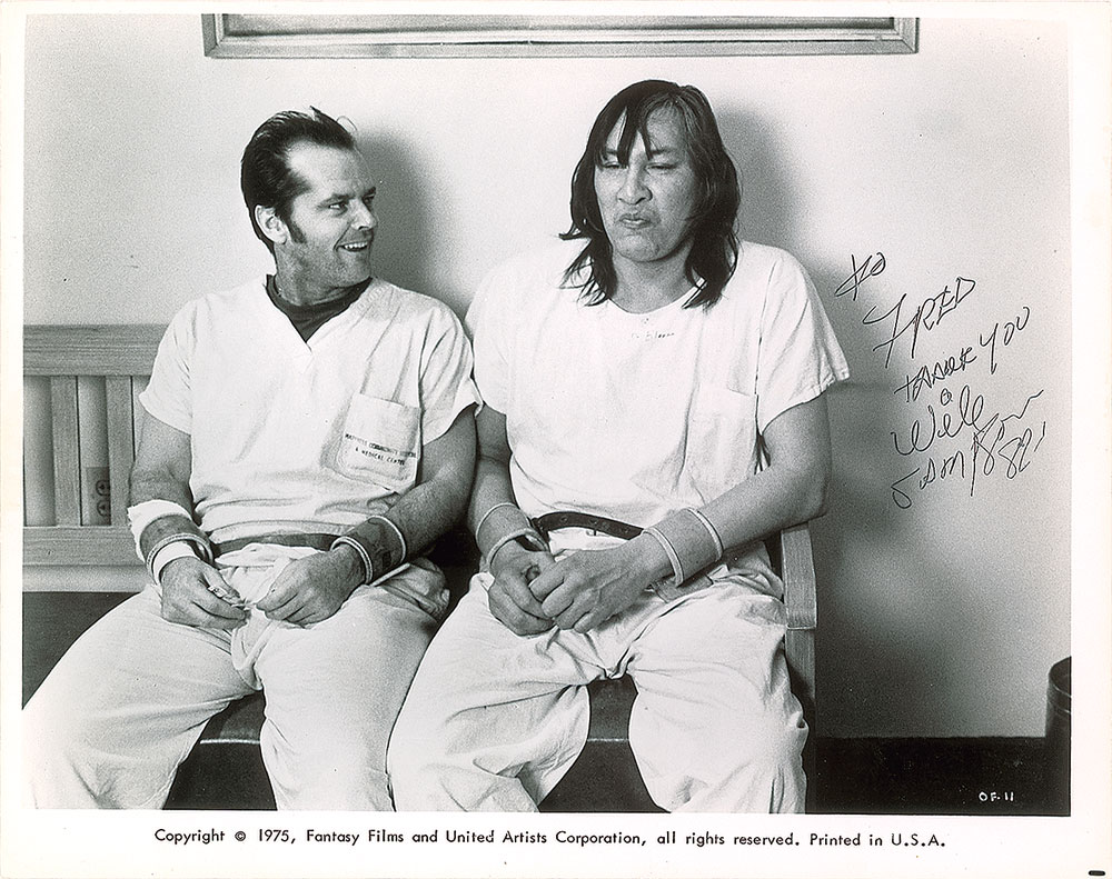 Sought-after glossy 10 x 8 United Artists publicity photo of Randle McMurphy and Chief Bromden chewing gum together, signed and inscribed in black ballpoint, “To Fred, Thank you, Will Samson, ‘82.” In fine condition. Pre-certified PSA/DNA.