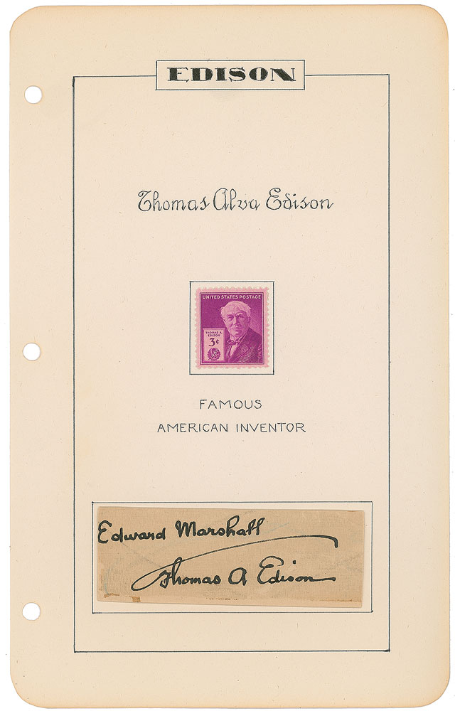 Sought-after ink ‘umbrella’ signature, “Thomas A. Edison,” on an off-white card with an attractive 6 x 9.5 album page hand-embellished with a calligraphic title and postage stamp honoring the great inventor (card no longer affixed). In fine condition, with mounting remnants on reverse and trimmed edges.