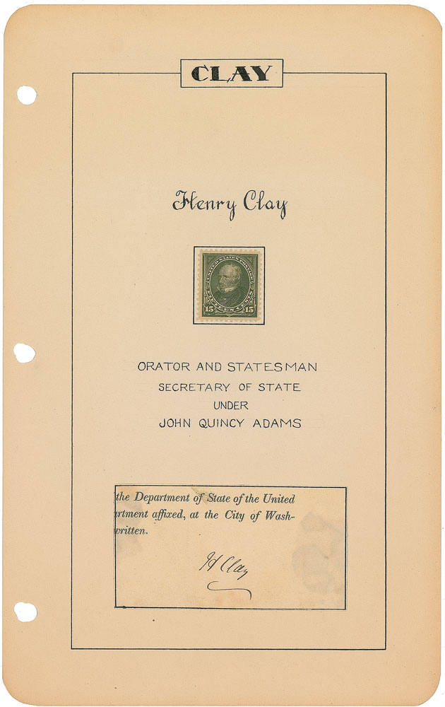 Neat ink signature, “H. Clay,” on an off-white slip clipped from a document, affixed to an attractive 6 x 9.5 album page hand-embellished with a calligraphic title and postage stamp honoring the former secretary of state. In fine condition, with slight show-through from mounting remnants to reverse.