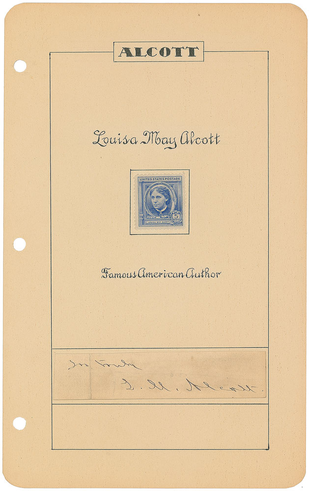 Attractive ink signature, “Yrs. truly, L. M. Alcott,” on an off-white slip affixed to an appealing 6 x 9.5 album page hand-embellished with a calligraphic title and postage stamp honoring the noted authoress. In fine condition, with a vertical crease to left side. From the Francis Greeley collection. Pre-certified PSA/DNA.