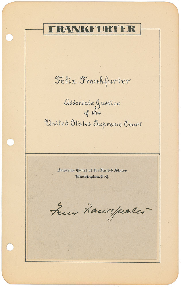 Bold ink signature, “Felix Frankfurter,” on an off-white Supreme Court card affixed to an attractive 6 x 9.5 album page hand-embellished with a calligraphic title. In fine condition. From the Francis Greeley collection. Pre-certified PSA/DNA.