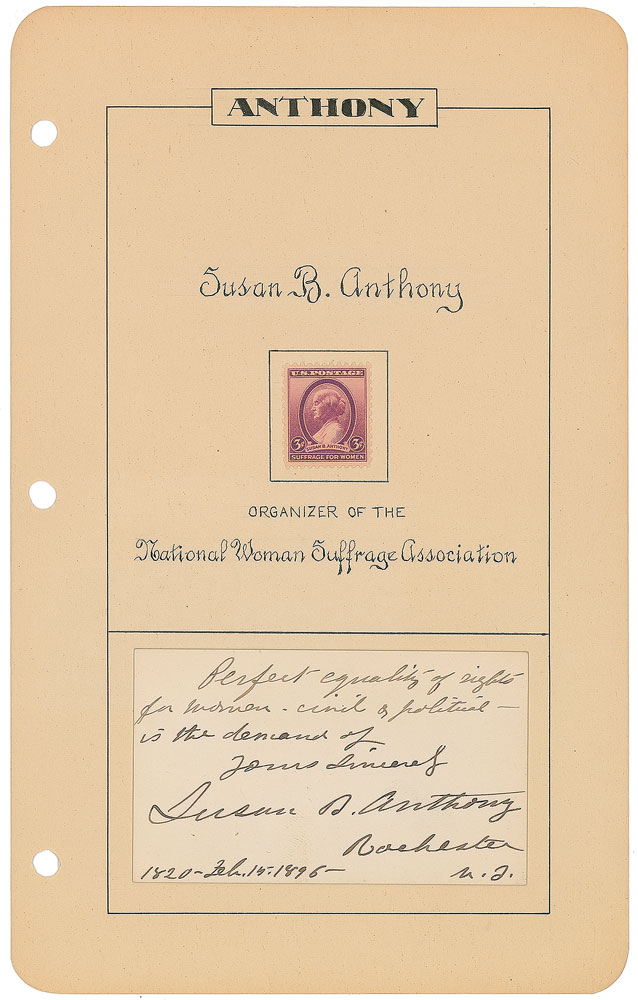 AQS on an off-white 3.75 x 2.25 card. In full: “Perfect equality of rights for women, civil and political—is the demand of, yours sincerely, Susan B. Anthony, Rochester, N. Y., 1820–Feb. 15. 1895.” In fine condition. Accompanied by the hand-embellished album page to which it was previously affixed.