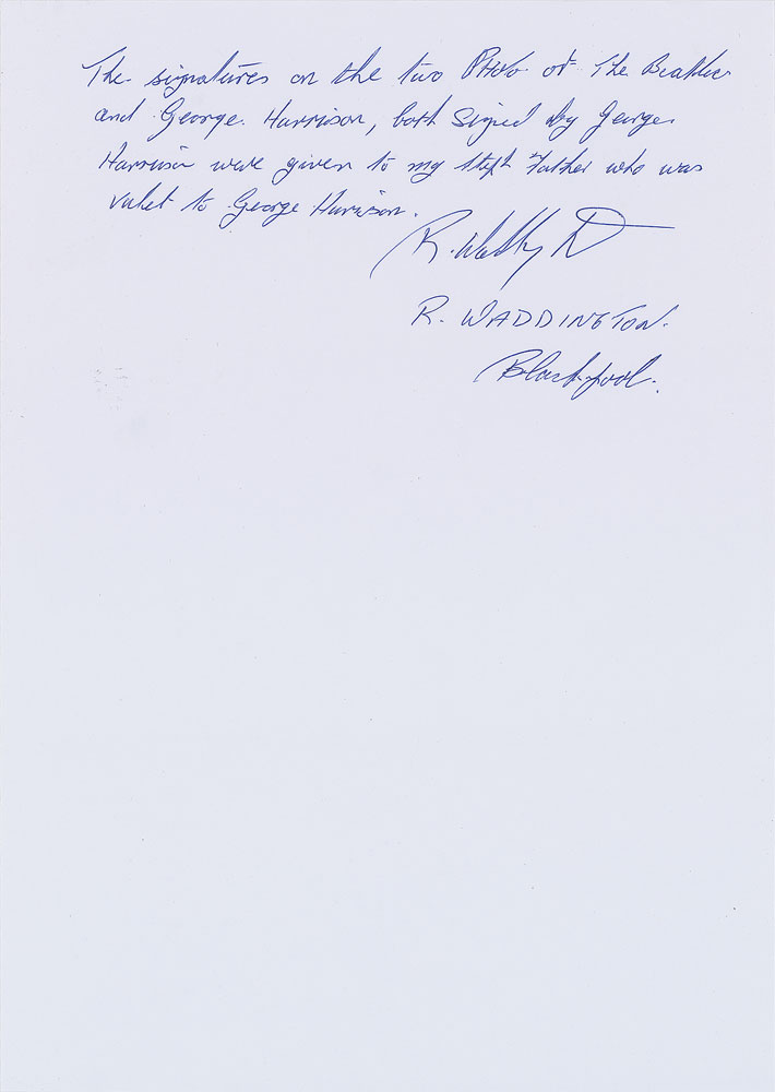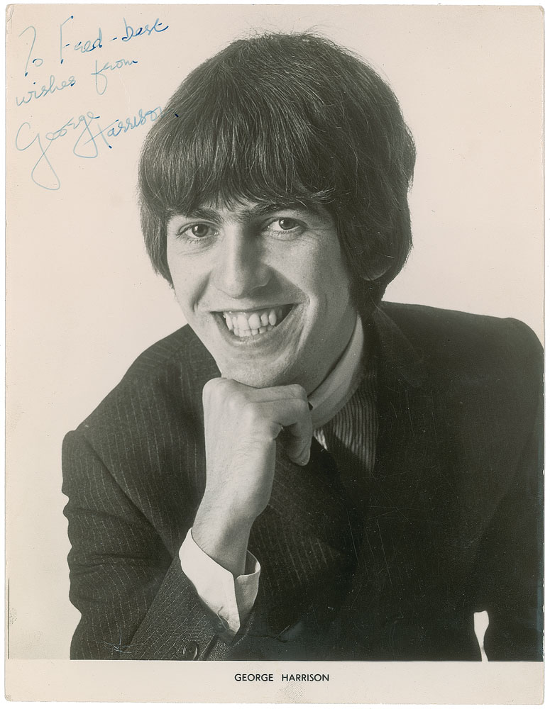 Fantastic vintage circa 1965 semi-glossy 6.5 x 8.5 publicity photo of a young Harrison, signed and inscribed in fountain pen, “To Fred‚ best wishes from George Harrison.” In fine condition, with a few small creases and edges possibly trimmed. Accompanied by a certificate of authenticity from Tracks and a letter of provenance from the son of the original recipient, stating that the signed photo was given to his father who worked as George’s valet. Pre-certified REAL.
