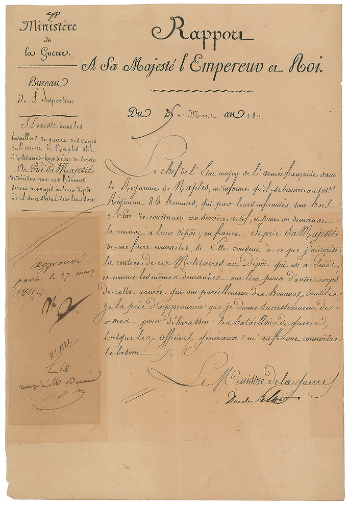 Manuscript DS in French, signed “Np,” one page, 8.25 x 12, March 29, 1811. Untranslated official military report submitted by Henri Jacques Guillaume Clarke, the Duke of Feltre. Prominently signed in the left margin by Napoleon with his approval. In very good condition, with several blocks of toning (one over the signature), and scattered folds and creases. Accompanied by an unsigned engraved portrait. Pre-certified PSA/DNA.
