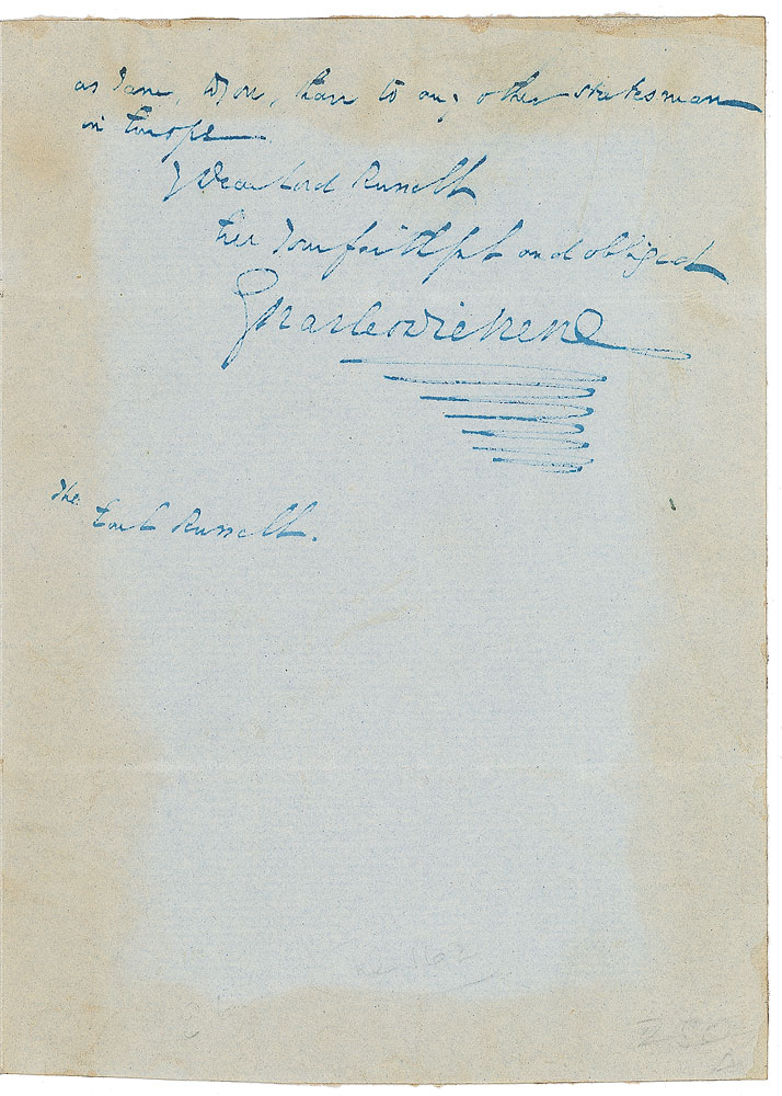 ALS, two pages on two adjoining sheets, 4.25 x 6, Gad’s Hill Place letterhead, October 22, 1863. Letter to the Earl Russell, in part: “Accept my most earnest thanks for your more than kind note. I am disappointed, of course—the more so, because I had seen him always at work, and had the strongest belief in his power to do what was needed, as well as any other well-educated youth—but if he had succeeded in the most brilliant manner, I could not have been more grateful to you than I am. I shall always treasure the remembrance of your goodness. You will excuse my adding from my heart that I would rather, in right of old faith in you and long admiration of you, stand so indebted to you as I am, to you, than any other statesman in Europe.” Affixed to a same-size sheet. In very good to fine condition, with a trimmed bottom edge and edge stains to second page from adhesive. Pre-certified PSA/DNA.