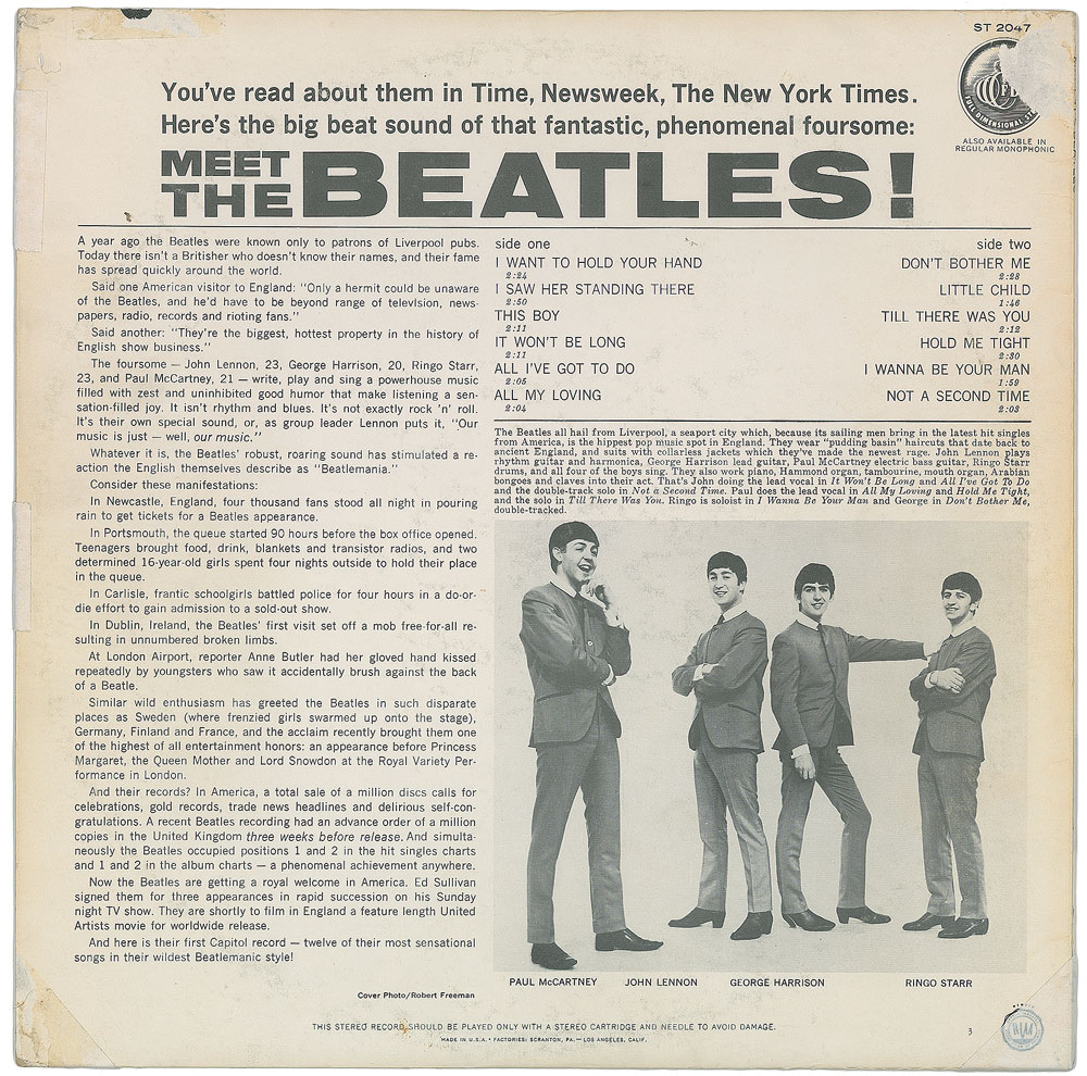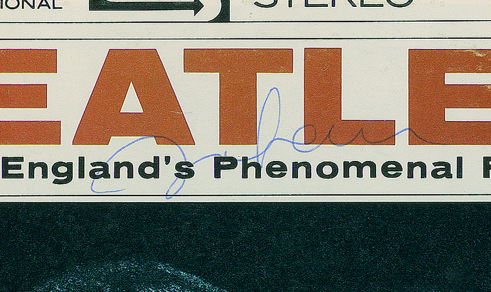 Meet the Beatles stereo album signed neatly on the front cover in blue ballpoint by John Lennon. In fine condition, with some minor tape remnants to corners of reverse. The record is not included. Accompanied by a full letter of authenticity from noted Beatles expert Frank Caiazzo, which reads, in part: "This cover was signed on Saturday May 17, 1975, when John was the special guest host for the weekend at the W. F. I. L. 'Helping Hands Marathon' in Philadelphia. This event was open to the public, and for a small donation, John would sign items of choice brought in by the donators."