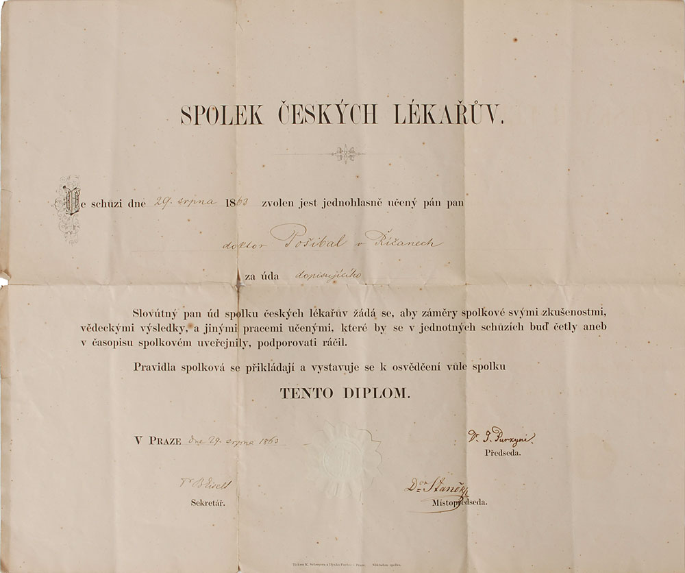 Czech anatomist and physiologist (1787–1869) who was one of the most well-known scientists of his time. Partly-printed DS in Czech, signed “Dr. J. Purkyne,” one page, 18 x 15, August 29, 1863. Untranslated Association of Czech Physicians diploma issued to Dr. Posibal v. Ricanech. In very good condition, with scattered overall foxing and splitting along intersecting folds. Pre-certified PSA/DNA.