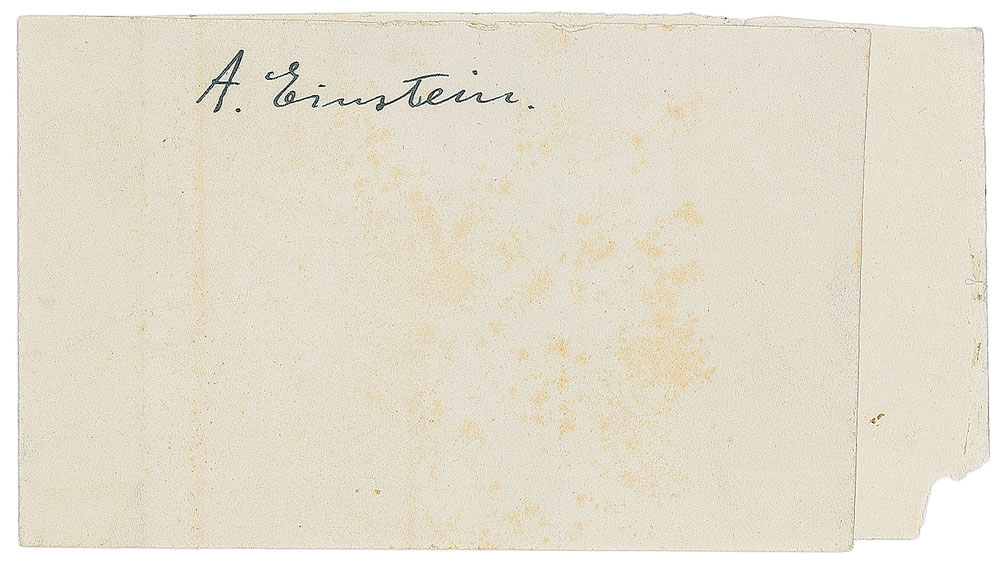 Crisp ink signature, “A. Einstein,” on an off-white 4 x 2.5 folded slip. In fine condition, with a vertical fold to right of signature, and faint overall foxing. Pre-certified PSA/DNA.