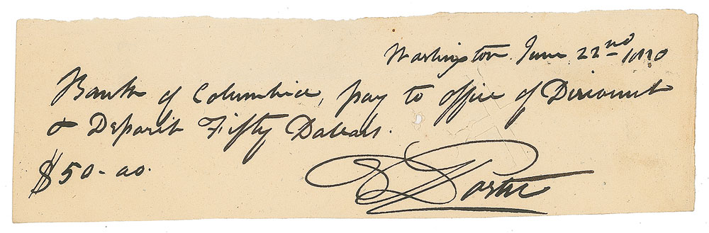 American naval officer (1780–1843) who led the first capture of a British vessel during the War of 1812 and who later served as commander-in-chief of the Mexican Navy. Autograph check, 8 x 2.25, filled out and signed by Porter, “D. Porter,” payable to the Office of Discount and Deposit for $50, June 22, 1820. In fine condition, with a small cancellation hole and cuts. Pre-certified PSA/DNA.