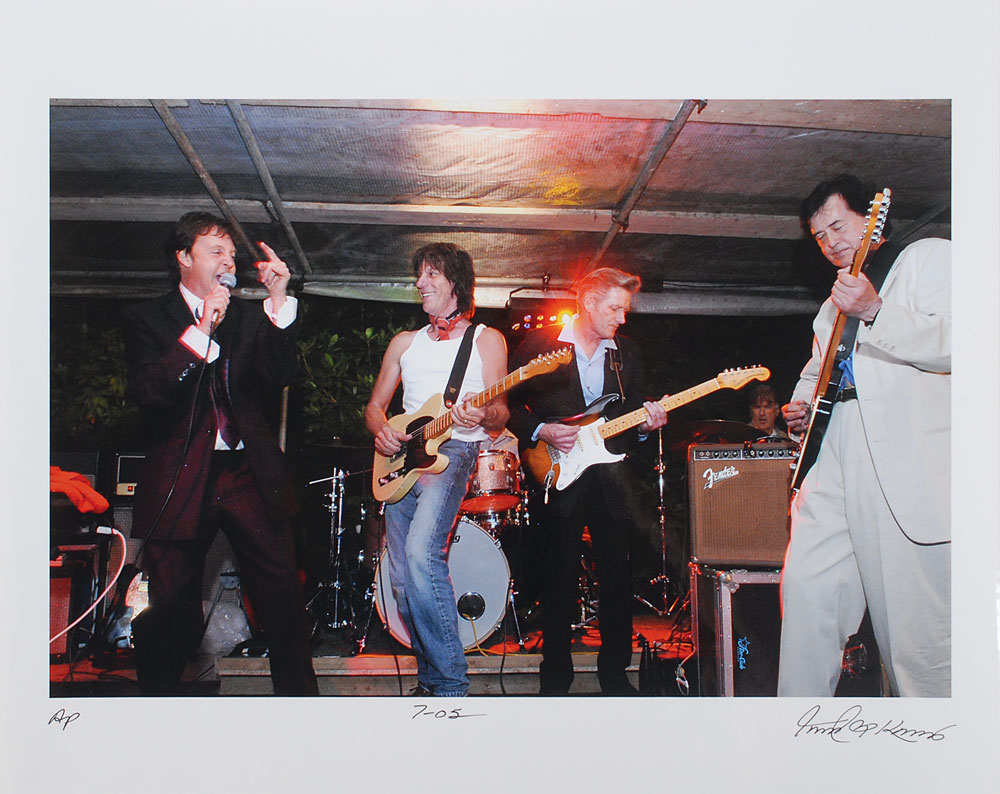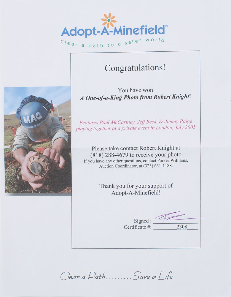One-of-a-kind color glossy 20 x 16 artist’s proof photo of Paul McCartney, Jeff Beck, and Jimmy Page playing together at a private event in London in July 2005, signed in the lower right by the photographer Robert Knight. In fine condition. Originally acquired from a silent auction at McCartney’s charitable Adopt-A-Minefield Gala in 2005 and accompanied by a certificate of authenticity from the event. Consignor notes that he attempted to have Jeff Beck sign the photo in 2008, but the guitarist exploded with rage saying that the photographer had promised not to print any images from that event.