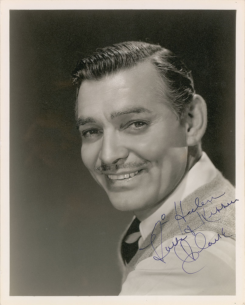 Dashing vintage matte-finish 8 x 10 close-up photo of Gable, signed and inscribed in blue ink, “To Helen, Love & Kisses, Clark.” Reverse bears a Clark Gable MGM stamp. In fine condition. Pre-certified PSA/DNA.