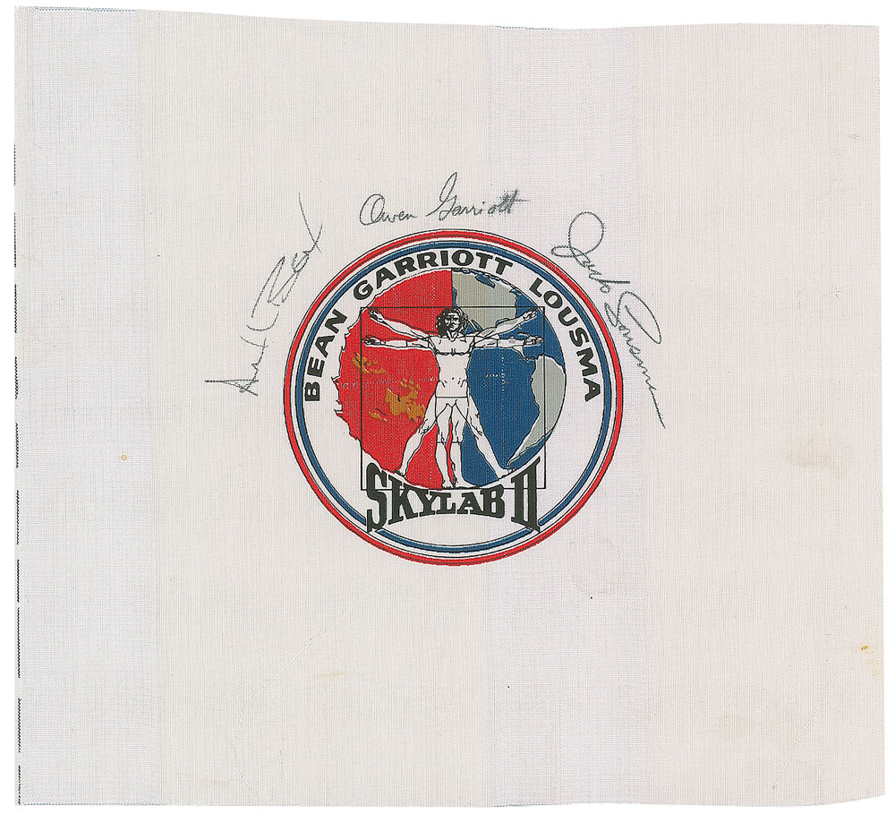 A 9 x 8.5 swatch of Beta cloth bearing a 3.5″ diameter Skylab II (SL–3) mission insignia in the center, signed around the emblem in black ballpoint by Alan Bean, Owen Garriott, and Jack Lousma. In fine condition. Pre-certified Zarelli Space Authentication.