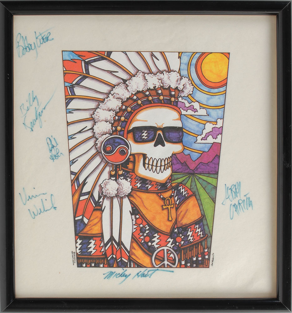 Colorful t-shirt artwork pelon of a skeleton dressed in Native American Indian attire, dated 1990, 15.5 x 17, signed in blue felt tip by Jerry Garcia, Mickey Hart, Phil Lesh, Bill Kreutzman, Bob Weir, and Vince Welnick. Includes a handwritten letter from a band representative on Grateful Dead letterhead transmitting the piece for a charity auction. Framed and in fine condition. These pelons were printed in very low quantities making this a very scarce piece. It also remains bright and vivid with ideal, bold signatures unlike many others we have seen. Pre-certified REAL.