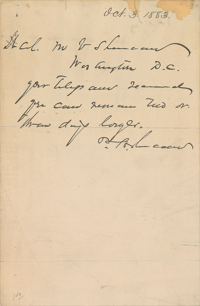 ALS signed “P. H. Sheridan,” one page, 5.25 x 7.75, October 3, 1883. Letter to his brother Lt. Col. Michael Vincent Sheridan, in full: “Your telegram received. You can remain two or three days longer.” In very good condition, with small tears and stains to top edge, and light overall handling wear. Pre-certified PSA/DNA.