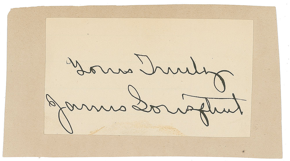 Bold ink signature, “Yours Truly, James Longstreet,” on an off-white 3.75 x 2.25 slip affixed to a slightly larger mount. In fine condition. Pre-certified PSA/DNA.