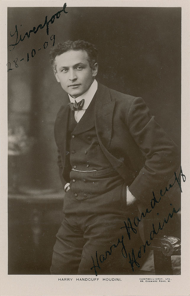 Remarkable vintage glossy 3.5 x 5.25 Campbell–Gray postcard photo of the master magician with his hands in his pockets, signed at the top in black ink, “Liverpool, 28–10–09,” and below, “Harry Handcuff Houdini.” In fine condition, with old mounting remnants to the reverse. Pre-certified PSA/DNA.