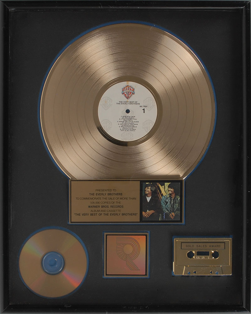 Official ‘R’ hologram-style RIAA gold sales award presented “to the Everly Brothers to commemorate the sale of more than 500,000 copies of the Warner Bros. Records album and cassette ‘The Very Best of the Everly Brothers.’” Framed with its disc, CD, cassette, and plate with a small image of the album cover to an overall size of 17 x 21. Award retains its original backing with a Fitzgerald Hartley label. In fine condition.