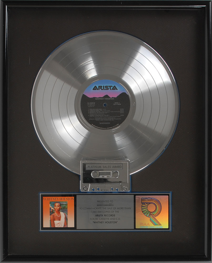 Official ‘R’ hologram-style RIAA platinum sales award presented “to commemorate the sale of more than 1,000,000 copies of the Arista Records album, cassette and C.D. ‘Whitney Houston.’” Framed with its disc, cassette, and plate bearing a small image of the album cover to an overall size of 17 x 21. Award retains its original backing with a Fitzgerald Hartley label. In fine condition.
