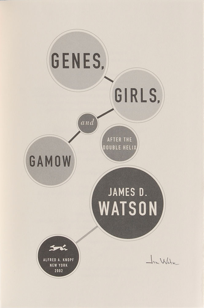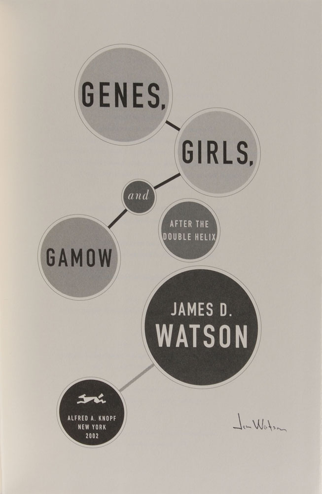 Three signed books: Genes, Girls, and Gamow. First American edition. NY: Alfred A. Knopf, 2002. Hardcover with dust jacket, 6.5 x 9.5, 259 pages. Each has been signed on the title page in black ballpoint, “Jim Watson.” In very fine condition. Pre-certified PSA/DNA.