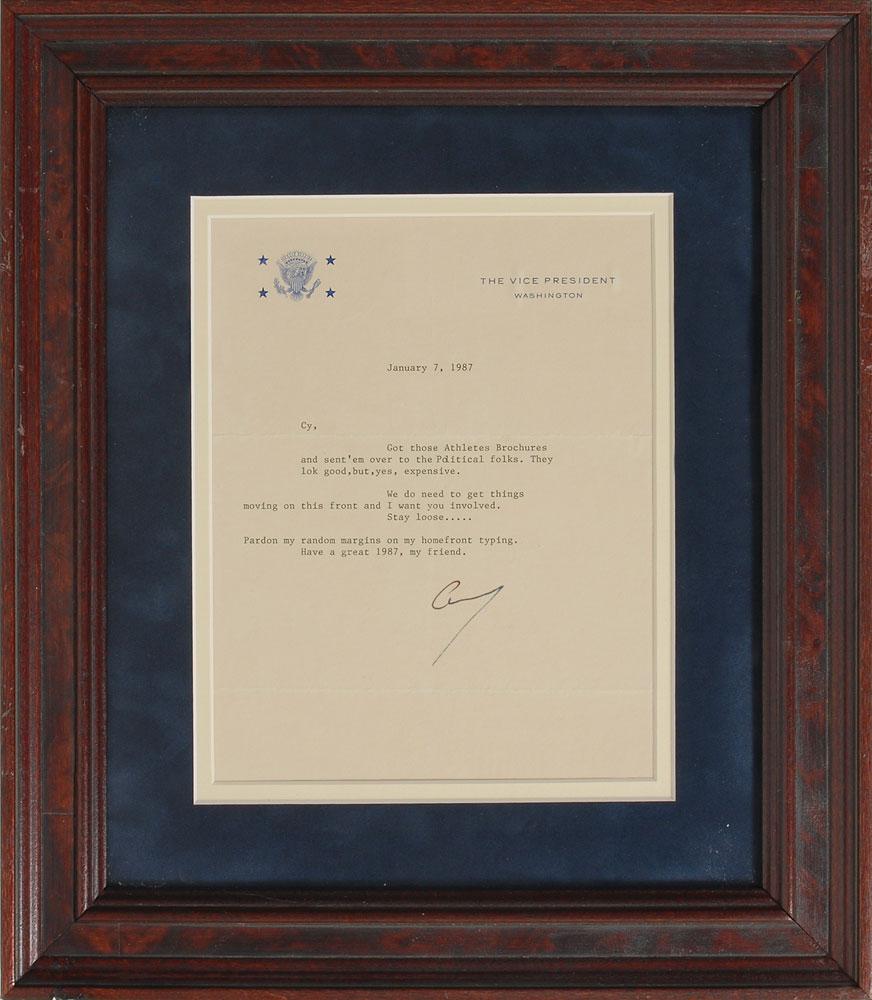 TLS as vice president signed “George,” one page, 6.5 x 8.25, The Vice President letterhead, January 7, 1987. Letter to Cy, in full: “Got those Athletes Brochures and sent ’em over to the Political folks. They lo[o]k good, but, yes, expensive. We do need to get things moving on this front and I want you involved. Stay loose….Pardon my random margins on my homefront typing. Have a great 1987, my friend.” In fine condition. Pre-certified PSA/DNA.