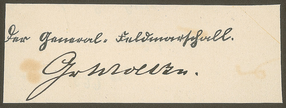 German military officer (1800–1891) who was chief of staff of the Prussian army for 30 years and who is regarded as one of the foremost military strategists of the 19th century. Ink signature, “G. v. Moltke,” on an off-white 3.75 x 1.25 slip affixed to a larger mount. In fine condition, with a couple of small stains. Pre-certified PSA/DNA.
