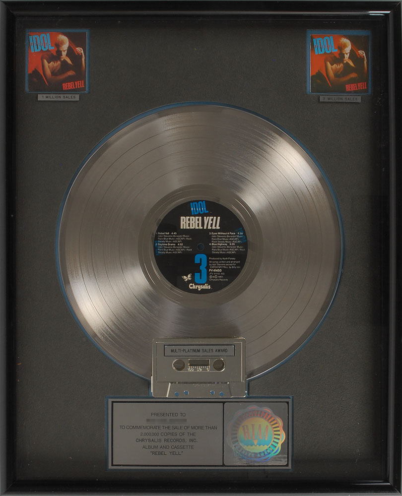 Official flower hologram-style RIAA double platinum sales award presented “to commemorate the sale of more than 2,000,000 copies of the Chrysalis Records, Inc. album and cassette ‘Rebel Yell.’” Framed with its disc, cassette, plate, and two small images of the album cover denoting platinum sales to an overall size of 17 x 21. Award retains its original backing with a Dejay Products label. In fine condition.