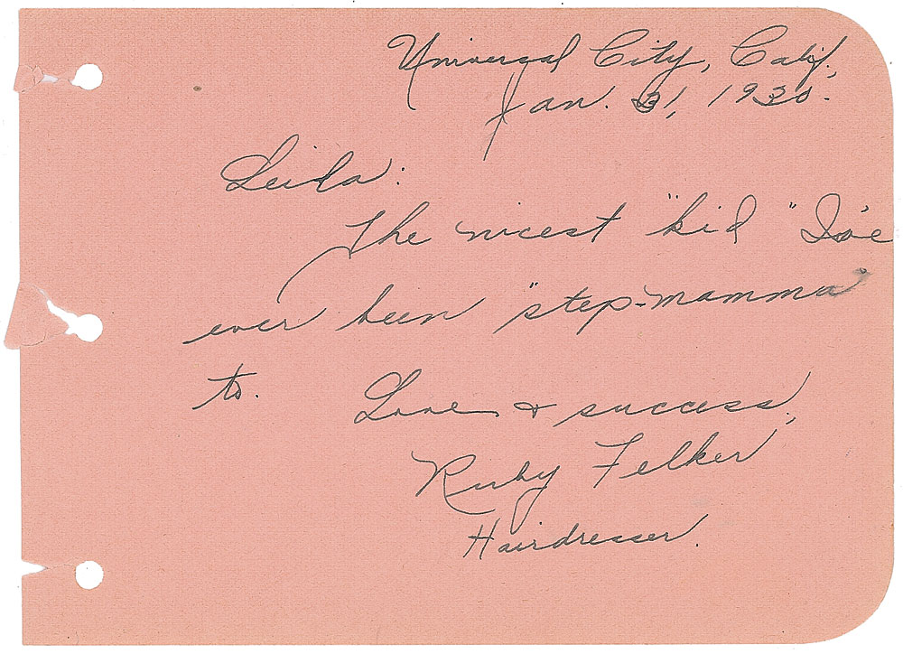 Hollywood hairdresser (1902–1986) who helped Jack Pierce with horror makeup and wigs. Scarce vintage fountain pen signature and inscription, “Universal City, Calif., Jan. 31, 1930, Leila: The nicest ‘kid’ I’ve ever been ‘step-mamma’ to: Love & success, Ruby Felker, Hairdresser,” on a pink 6 x 4.25 album page. In fine condition. Pre-certified PSA/DNA.