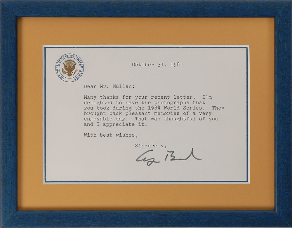 TLS, one page, 6.25 x 4.25, Vice President letterhead, October 31, 1984. Letter to Mr. Mullen, in full: “Many thanks for your recent letter. I’m delighted to have the photographs that you took during the 1984 World Series. They brought back pleasant memories of a very enjoyable day. That was thoughtful of you and I appreciate it.” Matted and framed. In fine condition. Pre-certified PSA/DNA.