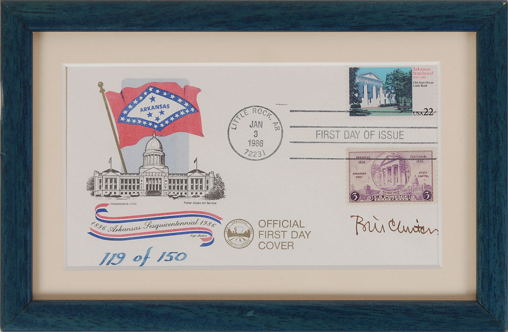 Limited edition FDC with a cachet honoring the Arkansas Sesquicentennial, numbered 111/150, signed in black felt tip. Framed and in fine condition. Pre-certified PSA/DNA.