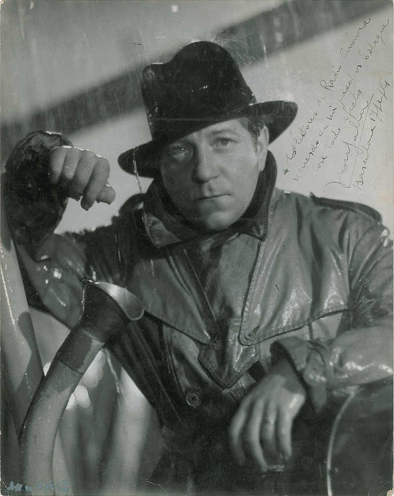 Vintage glossy 9.25 x 11.75 photo of a drenched Gabin wearing a rain coat, signed and inscribed in fountain pen, “Jean Gabin, Barcelona.” In very good to fine condition, with scattered creasing and surface impressions. Pre-certified PSA/DNA.