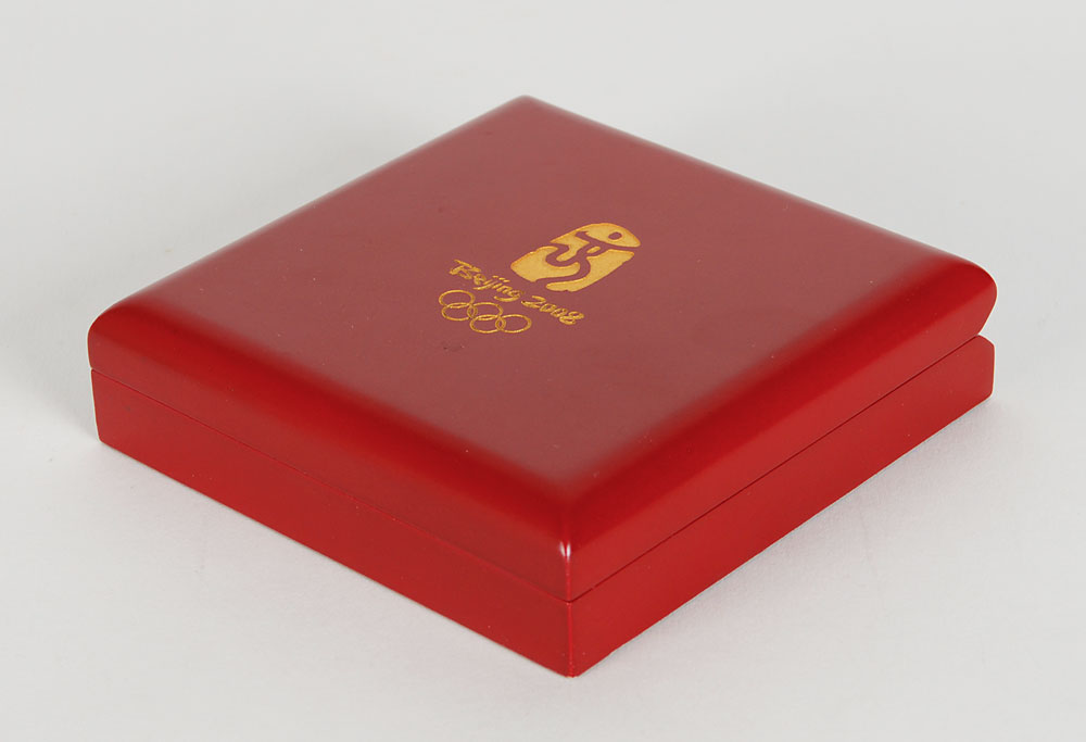 Participation medal issued for the 2008 Beijing Summer Olympics. Bronze, 55 mm, 122 gm. The front features the Beijing Games logo over the Bird’s Nest Olympic stadium, with raised Chinese and English text along the top; the reverse bears five Fuwa mascots over gusts of wind and engraved Chinese and English text, “One World One Dream.” Complete with its original red presentation case.