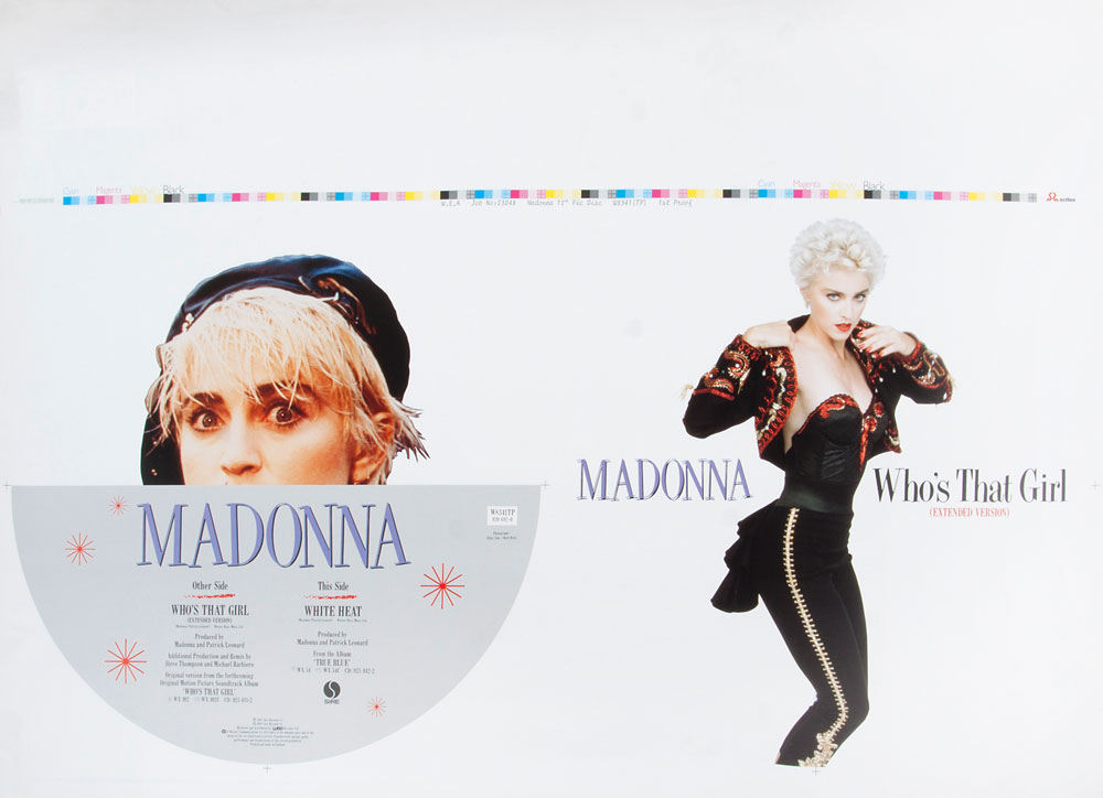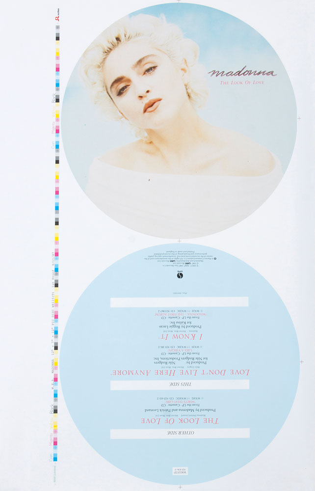 Fantastic set of three full-color original first proof artwork sheets for the limited edition UK 12″ picture disc singles ‘Who’s That Girl,’ ‘The Look of Love,’ and ‘Express Yourself,’ each measuring 25 x 18, including proofing bars and trim marks in the borders. In fine condition. An extremely attractive set of rare artwork for classic Madonna singles.