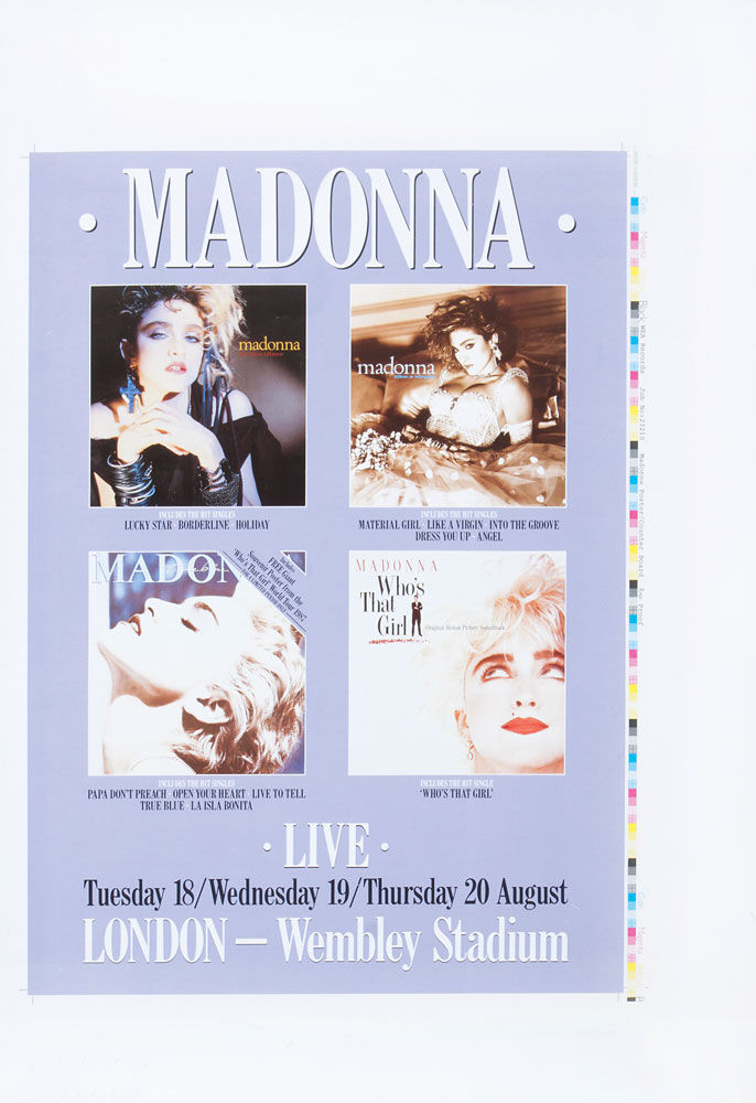 Attractive 1987 UK WEA full-color original first proof artwork sheet for a promotional poster and in-store display advertising her Wembley Stadium concerts and first four albums, 18 x 25, including proofing bars and job numbers in the borders. In fine condition.