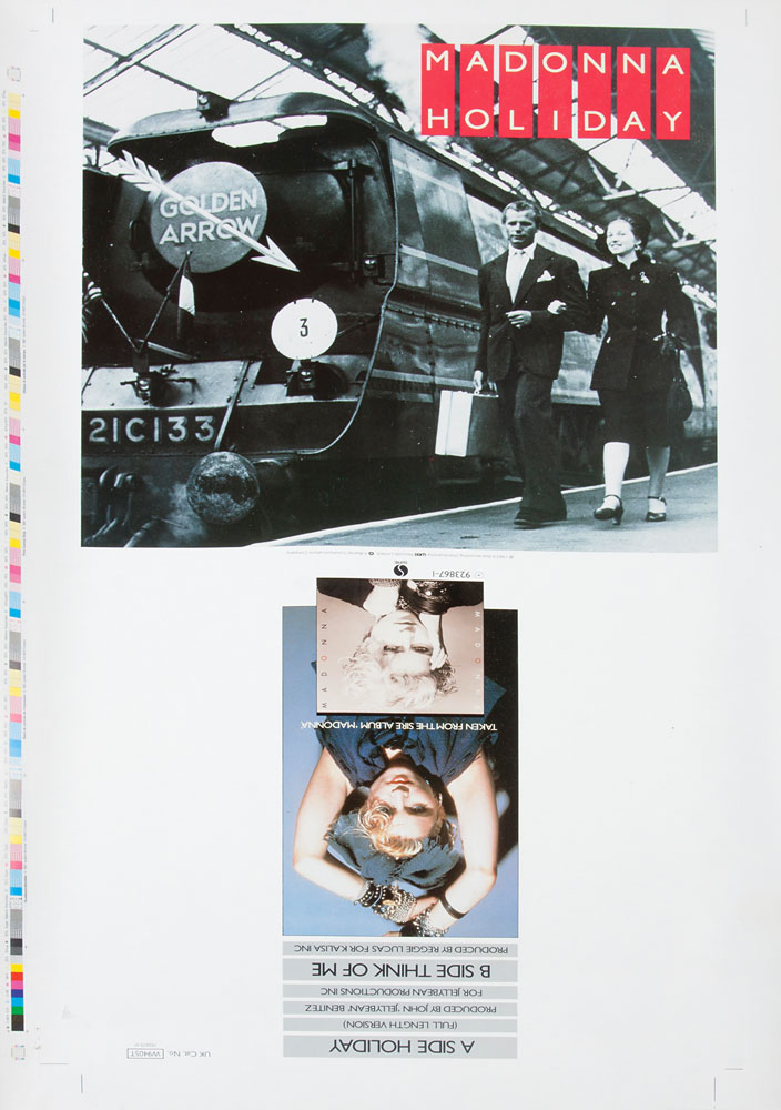 Early 1983 UK WEA/Sire original full-color first proof artwork sheet for the UK 12″ single of Madonna’s ‘Holiday,’ 15 x 26, featuring the front and back cover artwork with proofing bars and trim marks along the left side. In fine condition.