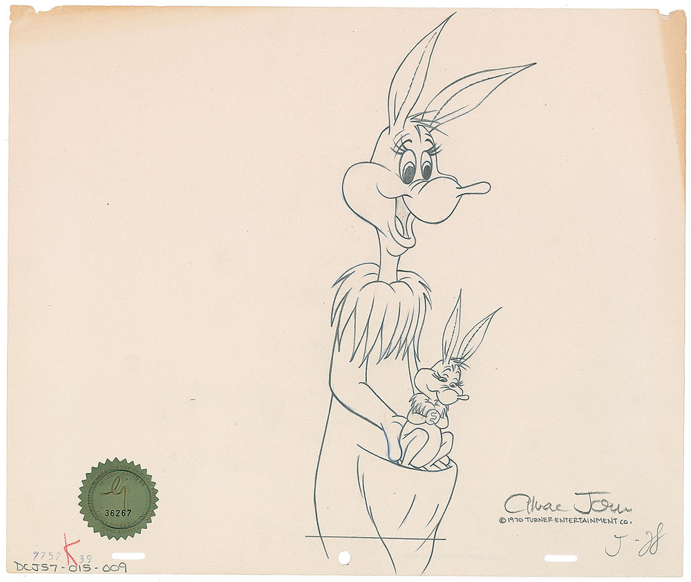 (Turner, 1970) Limited edition original production drawing featuring a pair of kangaroos from Dr. Seuss’ Horton Hears a Who, numbered “015–09,” showing the mother gingerly placing her baby inside her pouch, signed in the lower right in pencil by Chuck Jones. Accomplished in graphite and colored pencil on 12.5 x 10.5 animation paper with a Linda Jones Enterprises limited edition label. In fine condition, with some light chipping and toning to upper edges. Accompanied by a letter of authenticity from Linda Jones Enterprises. Pre-certified PSA/DNA.
