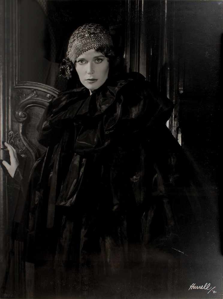Massive 36 x 48 three-quarter length photo of the lovely French actress Sylvia Kristel, signed in the lower right in white paint, “Hurrell/‘80.” Framed under Plexiglas and in fine condition. Hurrell photos of such atypical size remain highly desirable. Oversized. Pre-certified PSA/DNA.