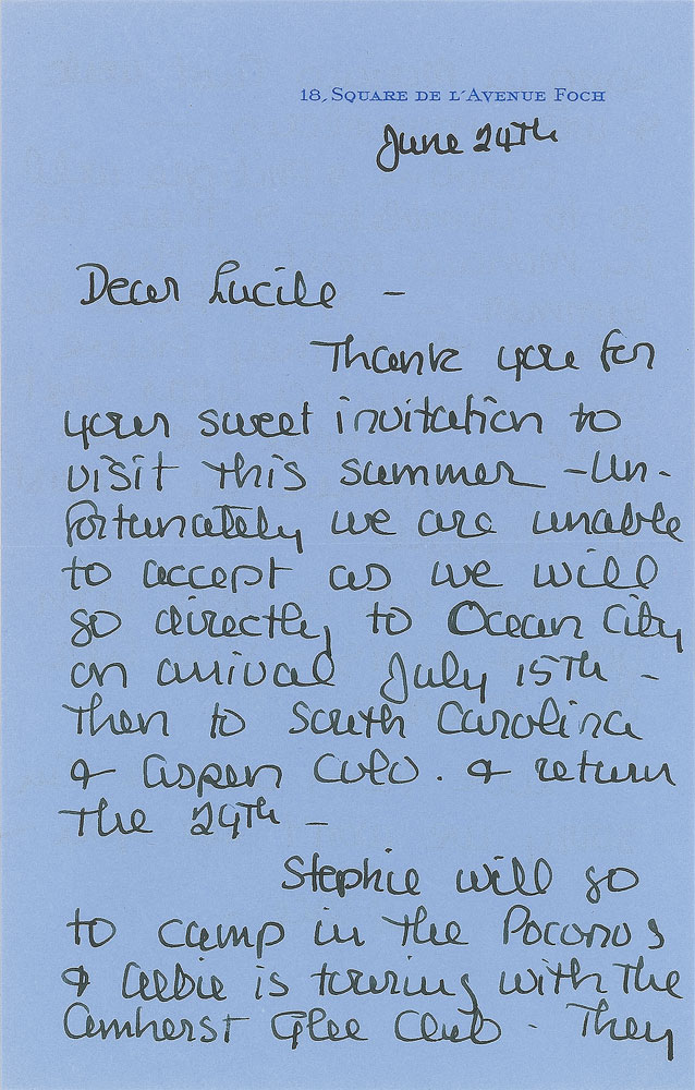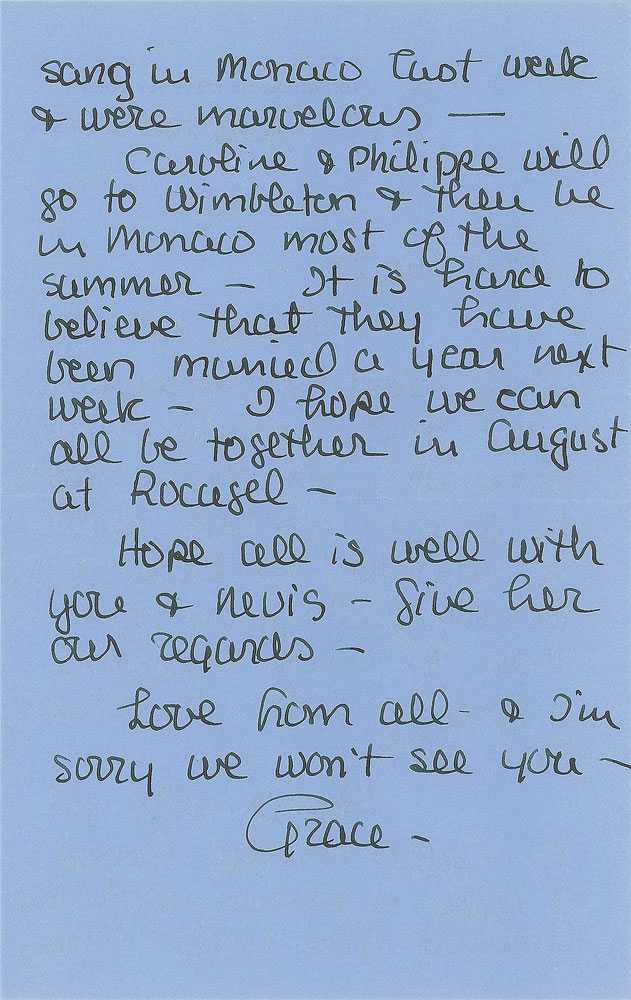 ALS signed “Grace,” two pages on two adjoining sheets, 5.25 x 8.25, Square de l'Avenue Foch letterhead, June 24, [1979]. Letter to Mrs. Marcel Palmaro. In part: “Thank you for your sweet invitation to visit this summer—unfortunately we are unable to accept…Stephie will go to camp in the Poconos & Albie is touring with the Amherst Glee Club. They sang in Monaco last week & were marvelous—Caroline & Philippe will go to Wimbledon & then be in Monaco most of the summer.” In fine condition. Accompanied by the original mailing envelope, addressed in her own hand. Pre-certified PSA/DNA.