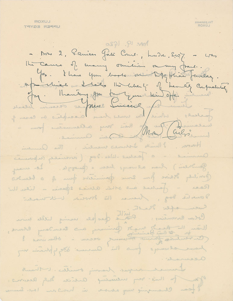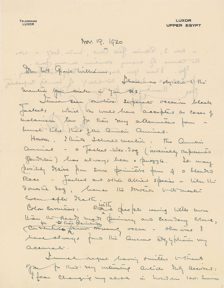 ALS, one page both sides, 8.25 x 10.5, Luxor letterhead, November 19, 1930. Letter to Grant Williams. In part: “I have no objection to the mention you made in your MS. I have seen on two separate occasions black Jackals, which one would have accepted as a case of melanism but for their very attenuated form—much like that of the Anubis animal. However, I think I should mention: the Anubis animal—a jackal-like dog (invariably represented genderless) has always been a puzzle. It may possibly derive from some primitive form of a blended race—Jackal and other allied species—like the domestic dog, hence the devotion to its master even after death. Colour conventions: with people using little more than the ready made primary and secondary colours, for their paintings, convention must necessarily occur—otherwise I have always found the Ancient Egyptians very accurate.” In fine condition. The Egyptian god Anubis, who served as a protector of graves and cemeteries, was portrayed either as a jackal or as a human with a jackal head. These depictions were therefore frequently found during excavations, including Carter’s discovery of a large statue of Anubis in the tomb of Tutankhamun. Boasting ideal Egyptology content, this is an extremely fascinating letter. Pre-certified PSA/DNA.